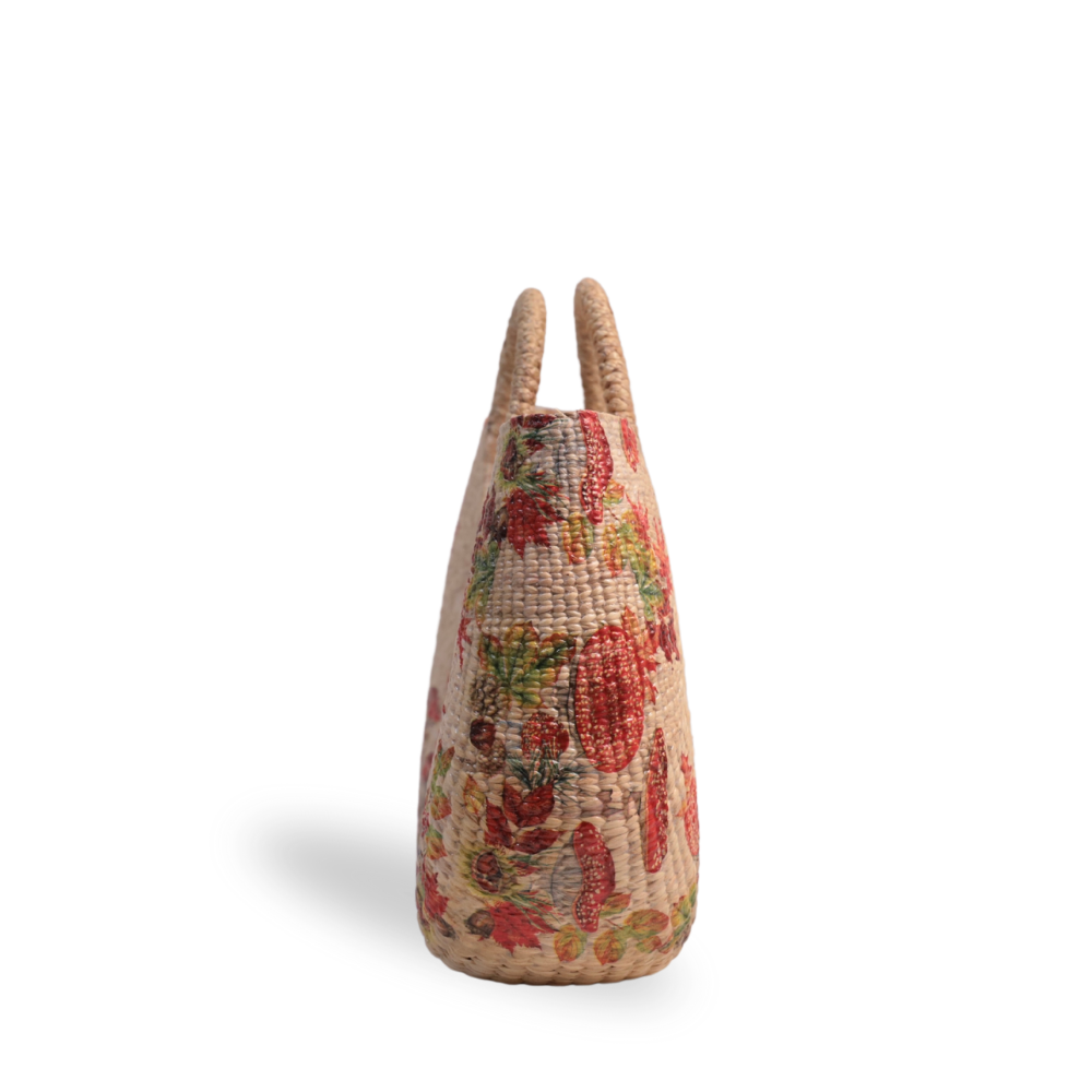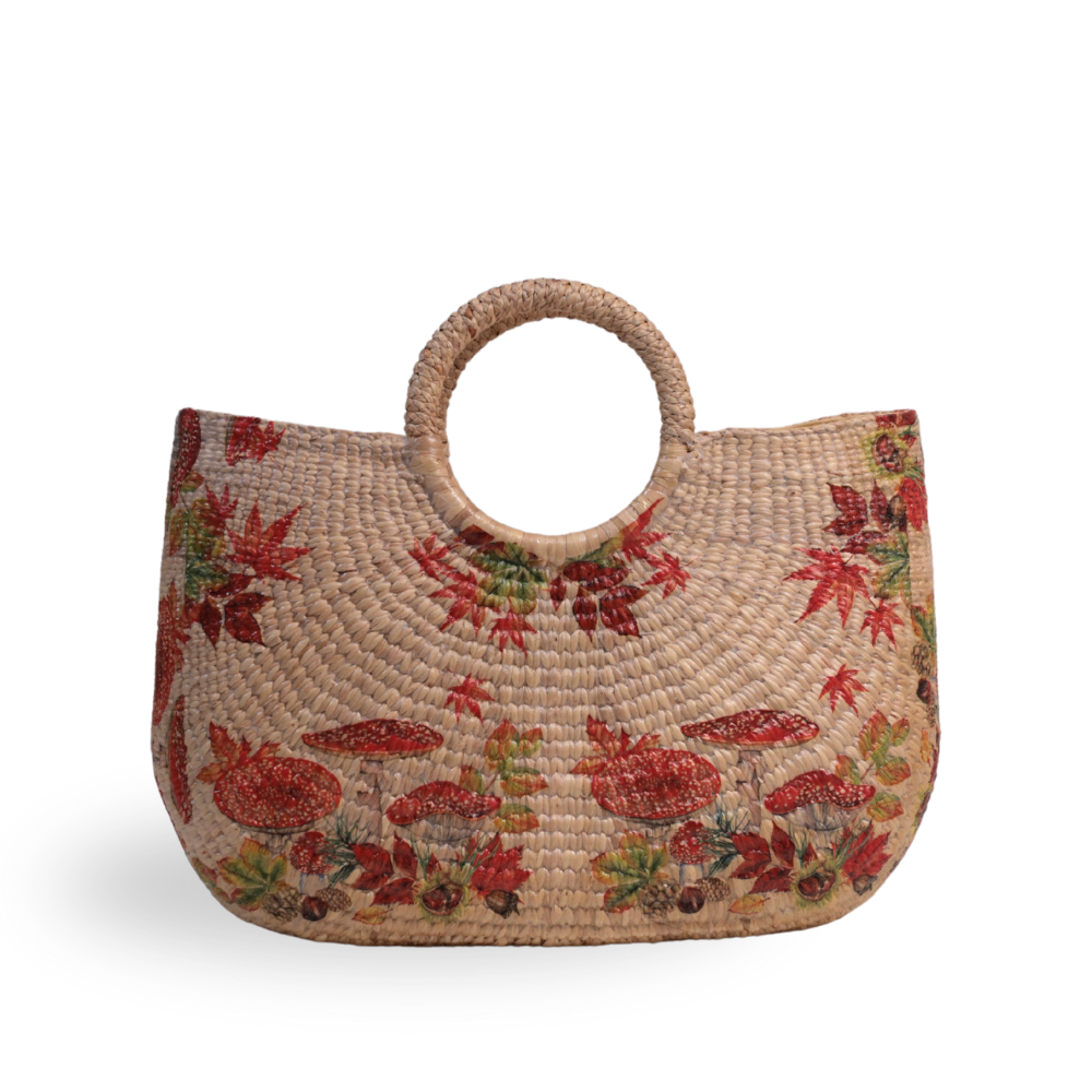แรงบันดาลใจจากเจ้าหญิงอันนา (Anna) จาก Frozen II และมนต์เสน่ห์ของฤดูใบไม้ร่วง กระเป๋าทรงกลมใบนี้สะท้อนความงดงามและความลึกลับของธรรมชาติผ่านลายใบไม้หลากสีและเห็ดป่า ถ่ายทอดความรู้สึกอบอุ่นและมีเสน่ห์ในทุกฤดูกาล