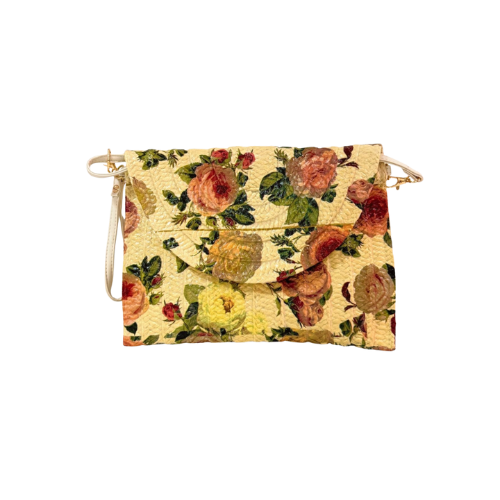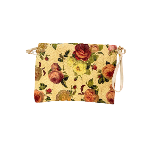 กระเป๋าคลัตช์ลาย ดอกกุหลาบสีพาสเทล ที่เต็มไปด้วยความโรแมนติกและความหรูหราสง่างาม เหมาะสำหรับงานเลี้ยงตอนเย็น งานแต่งงาน หรือโอกาสพิเศษที่ต้องการความประณีต