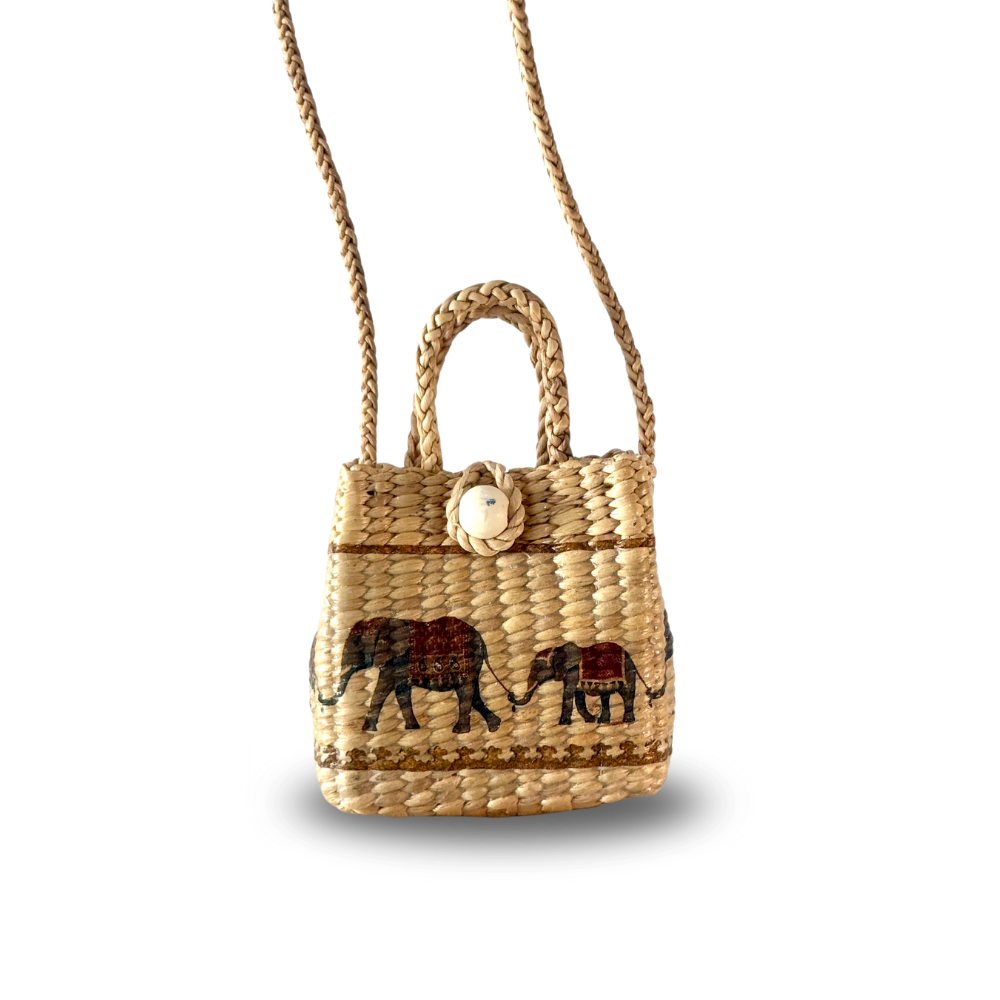 กระเป๋าสานทรงเล็ก ลวดลายมะกอกเขียวบนพื้นสีฟางธรรมชาติ ให้กลิ่นอายเมดิเตอร์เรเนียน อบอุ่น สบายตา พกพาสะดวก